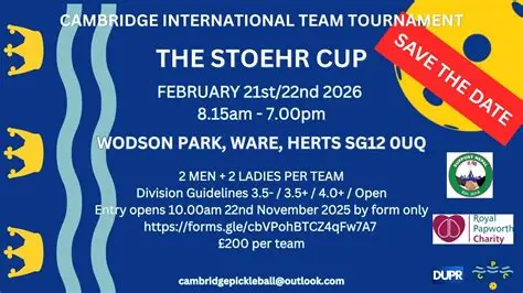 Our fifth tournament in memory of Peter Stoehr, one of the founders of Cambridge Pickleball Club. Team = 2 x men and 2 x women of similar level who must be able to play all weekend. Teams will be allocated a place in a category dependent on the average DUPR rating of the whole team. Seven rounds over the weekend will each comprise 1 x mens level doubles, 1 x ladies level doubles, 4 x mixed doubles (all team members play 2 x mixed).Teams play every other team in their division, games are to 11 no setting. Medallists are the teams with the highest number of points collected during the tournament.